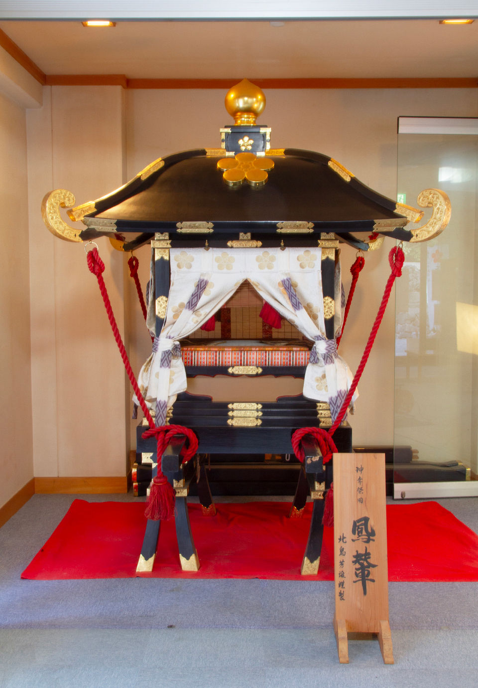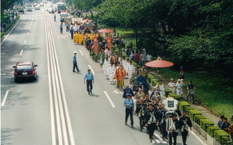 ご祭神の分霊を鳳輦(ほうれん)にお移し市内を巡る5年に1度の式年大祭の華とも いえる荘厳な行列。 氏子が平安時代の装束にて随従する。