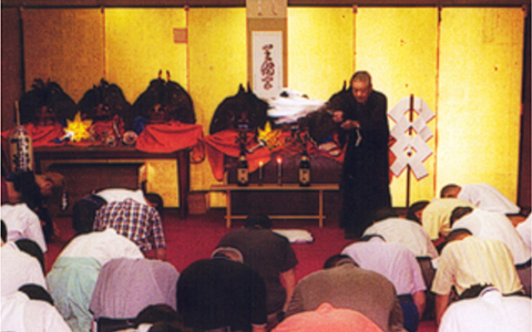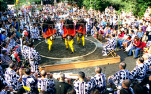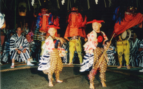 獅子舞宵宮参り終了後、境内にて平安時代から伝わる古式獅子舞が舞われる。