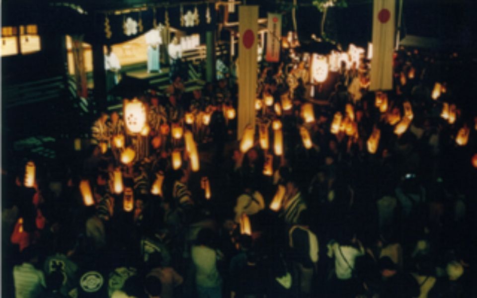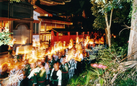 午後8時より。氏子が提灯を持って参集し、高張提灯・金棒を先導に天満宮の本殿の周りを時計回りに3周する特殊神事。