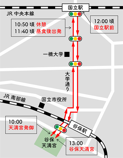 天満宮発御(10時)→休憩・昼食(10:50頃~/11:40発)→国立駅前(正午頃)→大学通り→天満宮着(13時)